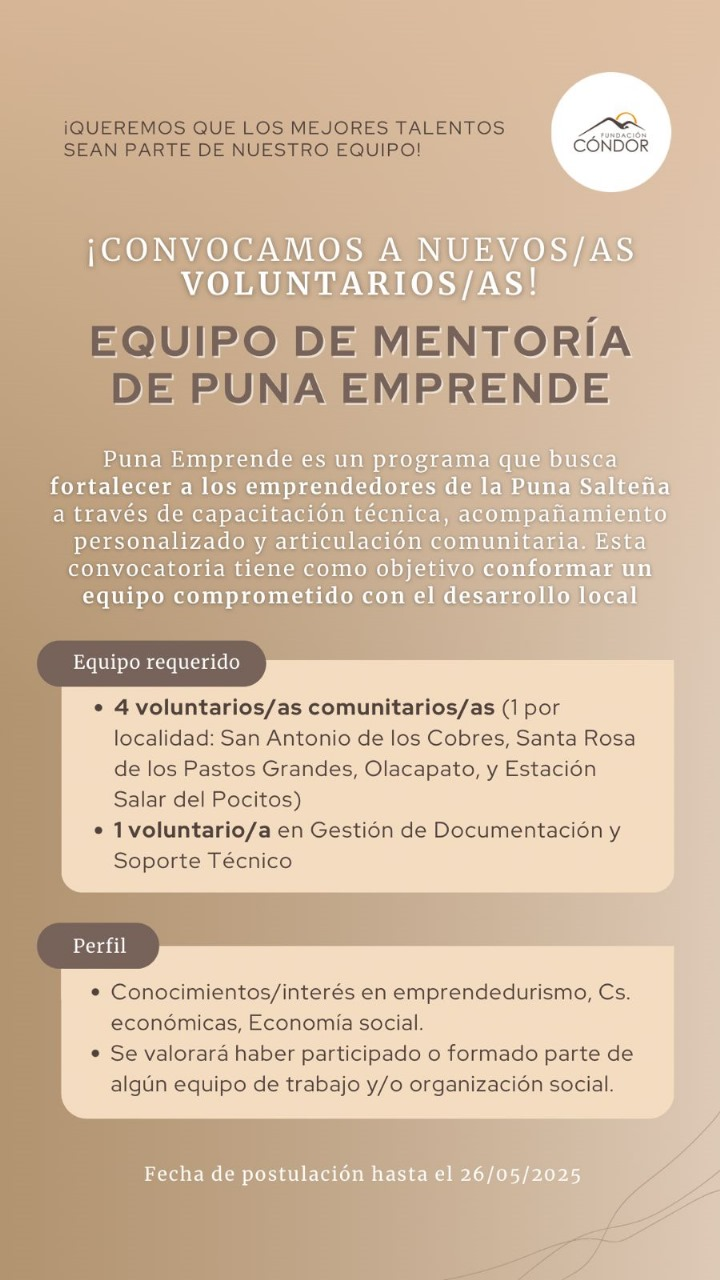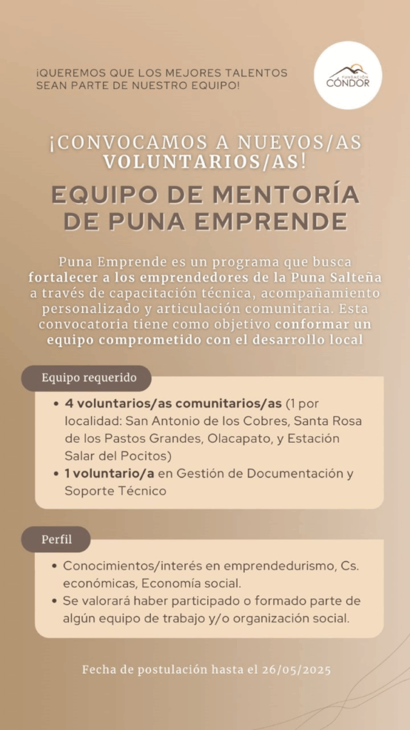 La Fundación Cóndor lanzó una convocatoria para cinco voluntarios que deseen desempeñarse como Coordinadores Comunitarios en el Programa Puna Emprende. El programa busca fortalecer el desarrollo de los emprendedores de la Puna a través de capacitación técnica y práctica.