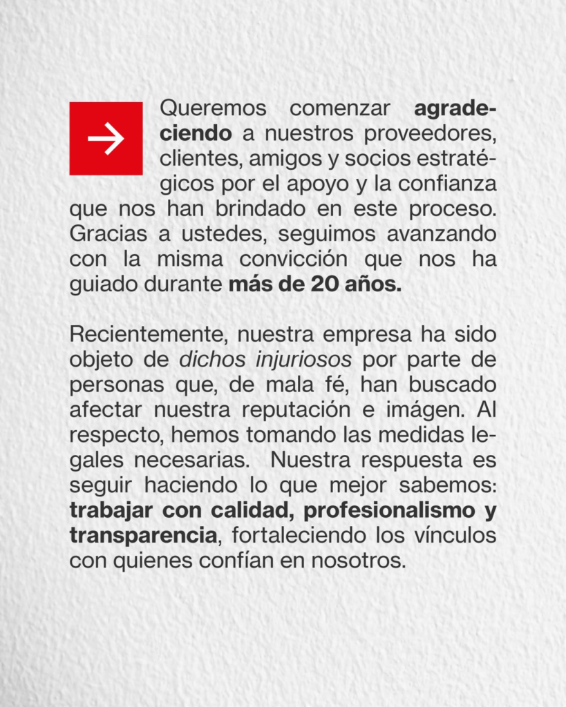 «Queremos compartir nuestro comunicado oficial frente a las recientes acusaciones infundadas que buscan afectar nuestra trayectoria. En INVLAC, reafirmamos nuestro compromiso con la calidad, el profesionalismo y el trabajo constante que nos caracteriza desde hace más de 20 años», destacó la descripción antes del comunicado.