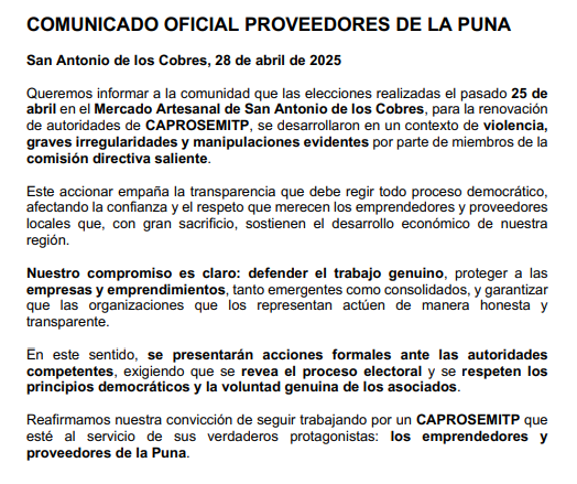 En respuesta, los Proveedores de la Puna anunciaron que presentarán acciones formales ante las autoridades competentes, exigiendo una revisión del proceso electoral y el respeto a los principios democráticos. «Nuestro compromiso es defender el trabajo genuino, proteger a las empresas y emprendimientos, y garantizar que las organizaciones que los representan actúen con honestidad», expresa el comunicado.