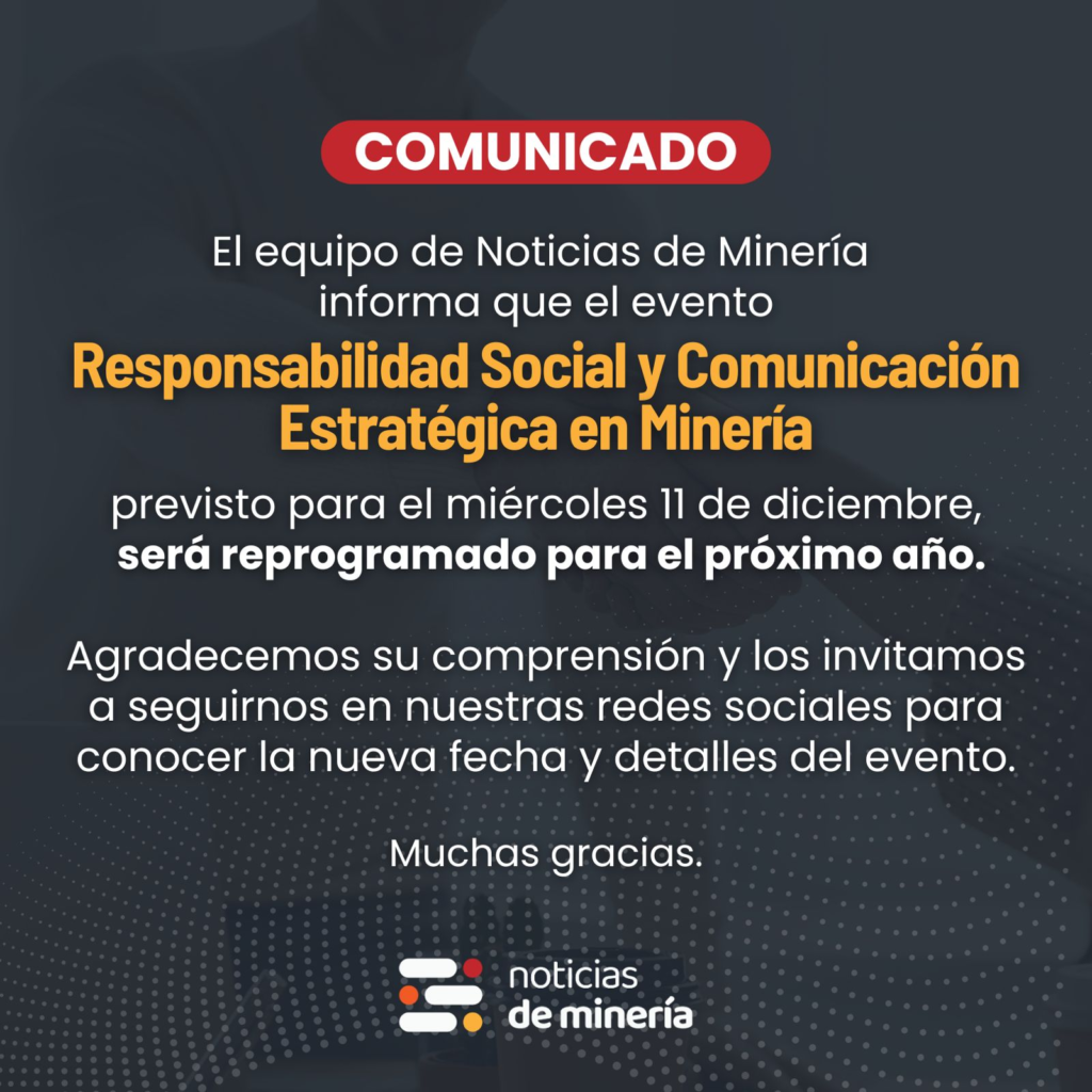 El equipo de Noticias de Minería informa que, debido a circunstancias imprevistas, el evento «Responsabilidad Social y Comunicación Estratégica en Minería» previsto para el miércoles 11 de diciembre, fue reprogramado para el próximo año.