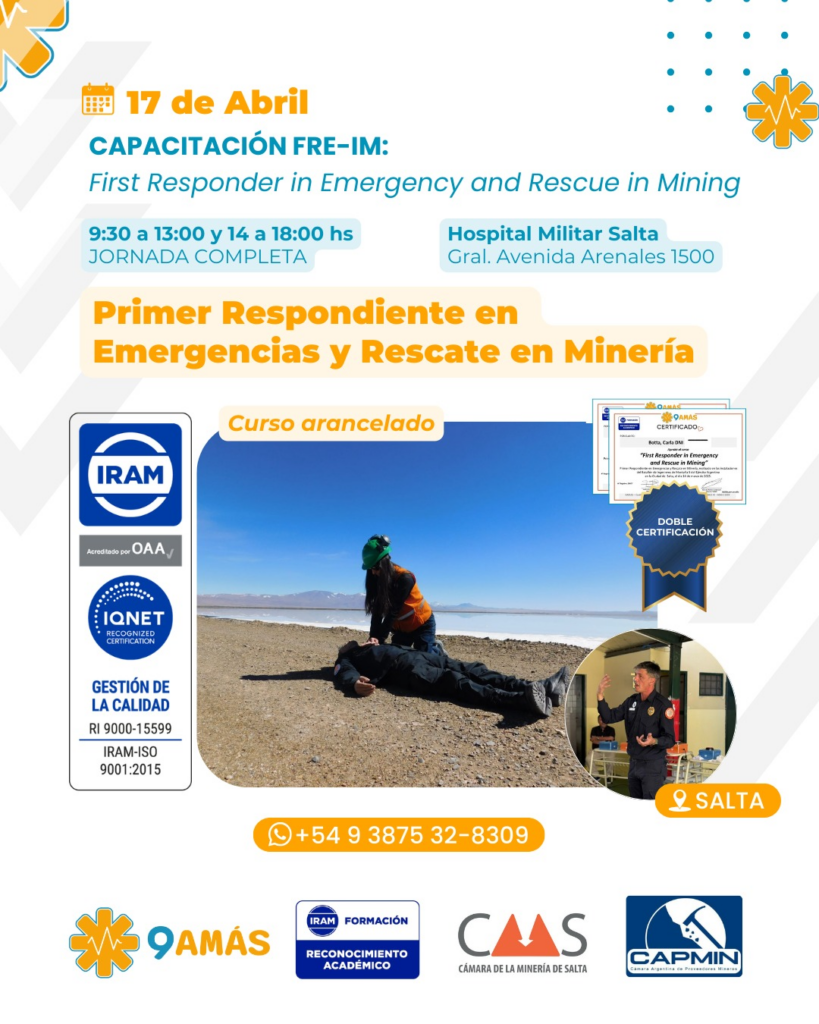 - Enfoque: Diseñada específicamente para las operadoras mineras, esta jornada de «Doble Certificación» (FRE-IM y 9AMÁS) se centra en la respuesta inmediata ante accidentes dentro de los yacimientos, considerando los riesgos específicos de la industria.